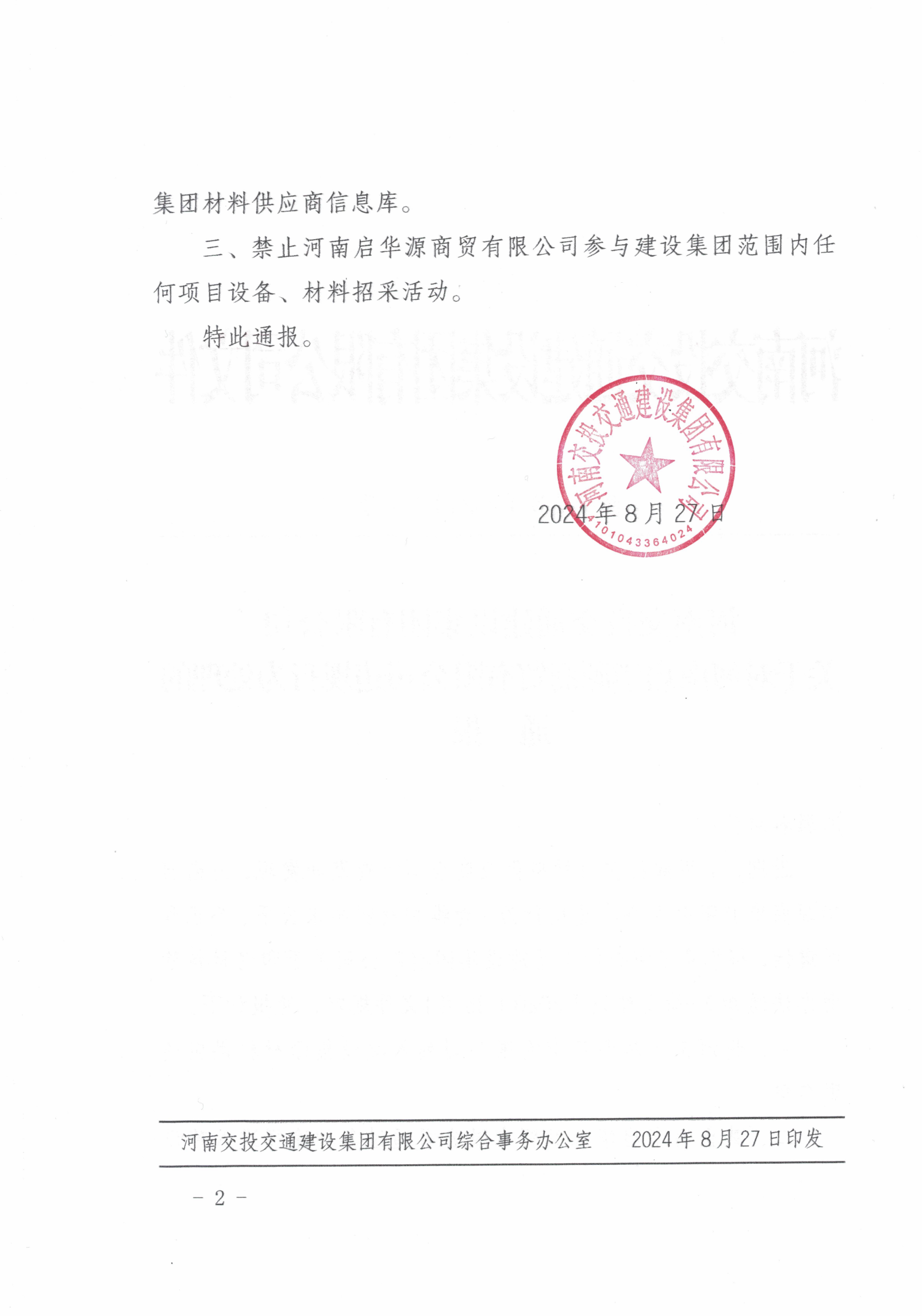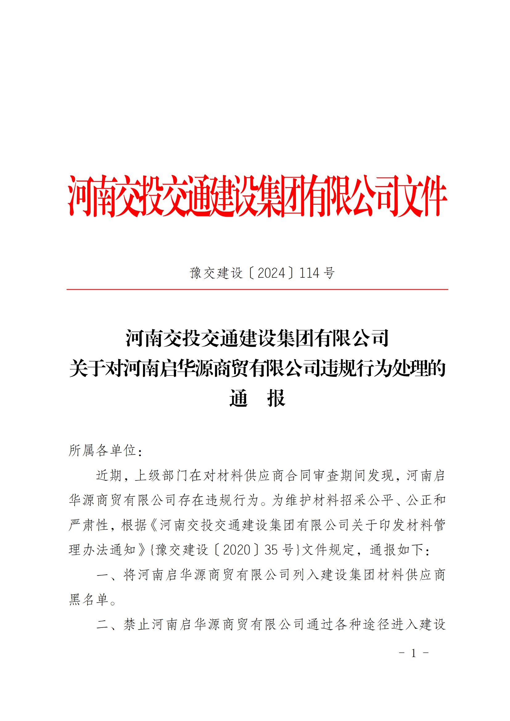 河南交投交通建设集团有限公司关于对河南启华源商贸有限公司违规行为处理的通报